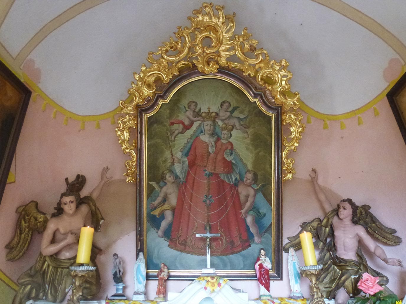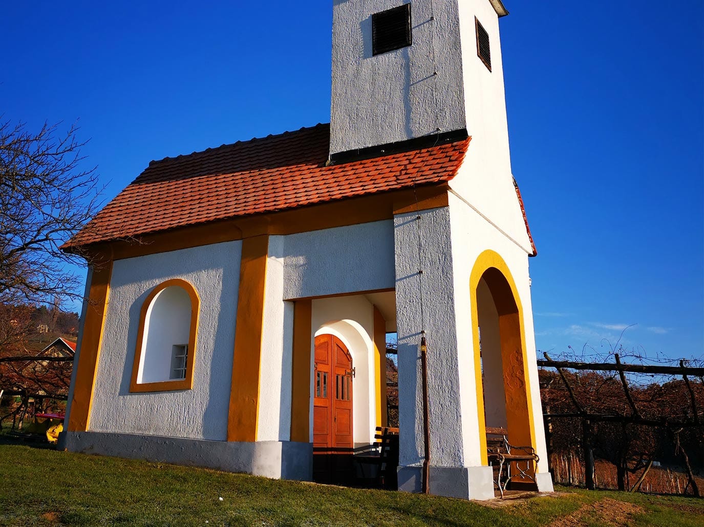 St. Anne, Kovača vas: The chapel was built in 1771. Later, a porch and a bell tower were added. The construction of the chapel is associated with a legend about a countess named Anne, who fell from her horse while horse riding. Because she survived the fall and was uninjured, she commissioned the construction of the chapel at the spot where she fell. Inside the chapel there is a painting of the pilgrimage of the Virgin Mary with Child in its original Rococo frame.