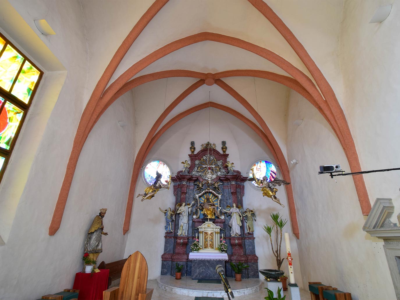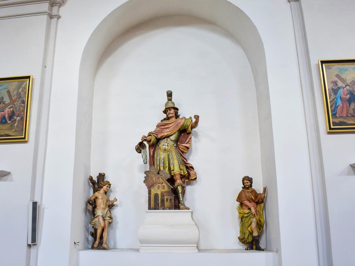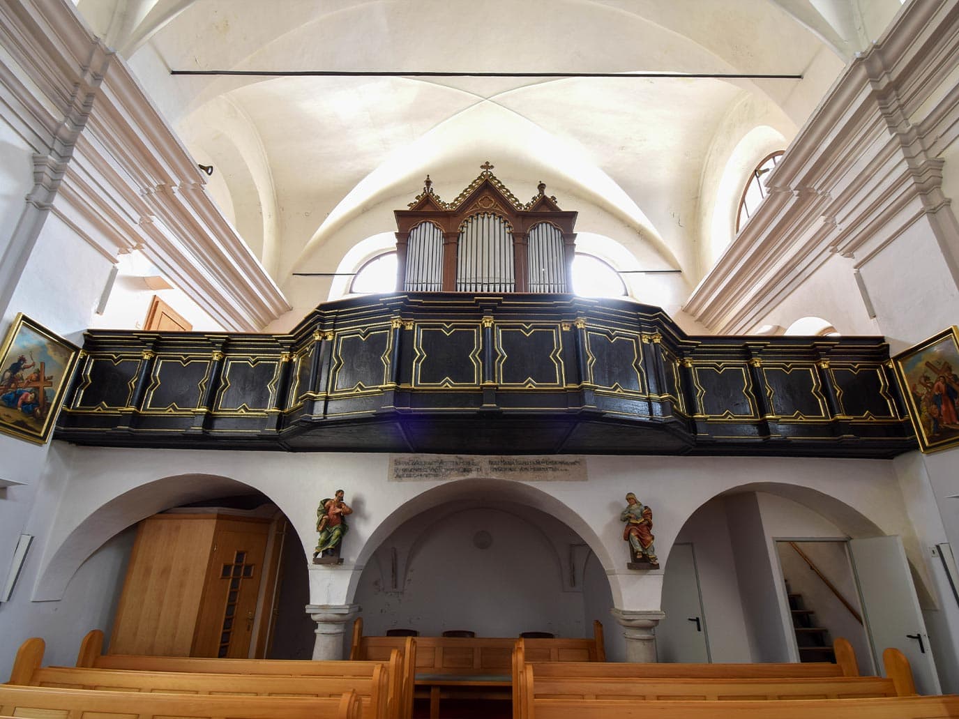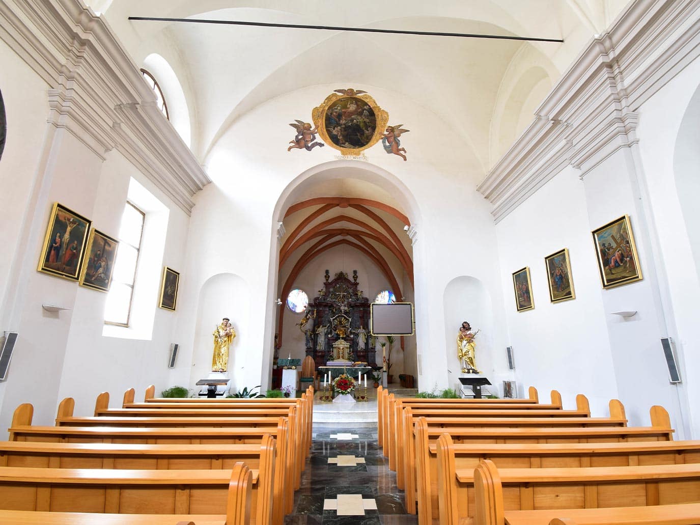 Mary of the Seven Sorrows: This originally Gothic church was rebuilt in the 17th century, when it was vaulted and an organ loft was added in the west. A few statues are preserved from the furnishings of the sculptor Franc Krištof Reiss which date from ca. 1700. The high altar from the 18th century was transferred here from the parish church, since the former altar, painted on the wall, was destroyed during World War II when, as a result of the widening of the street, the presbytery was truncated.